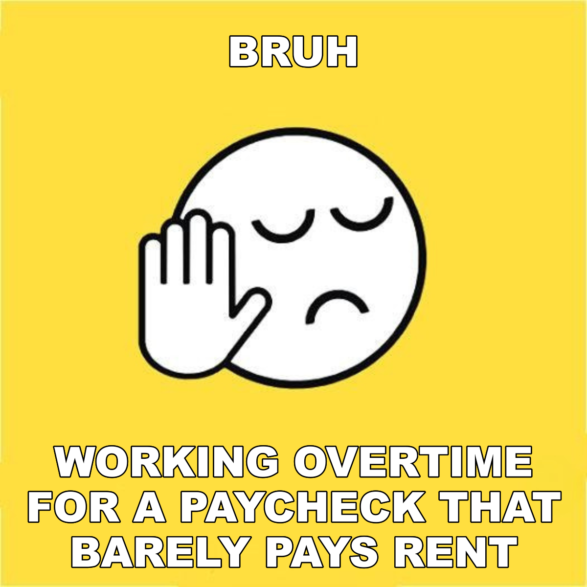 Bruh / Working Overtime For A Paycheck That Barely Pays RentRelatable bruh meme capturing the struggle of working overtime just to pay the rent. A must-share for anyone hustling in adulthood!work-hustlePublished on November 14, 2025Tags#bruh#meme#work#hustle#adulting#paycheckCopy LinkDownload PNG